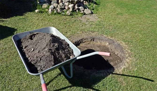 - Розмір вогнища визначаємо аналогічно розміру цегляного вогнища. Наприклад, візьмемо круг діаметром 130 см. Викопуємо яму глибиною 10 см.
