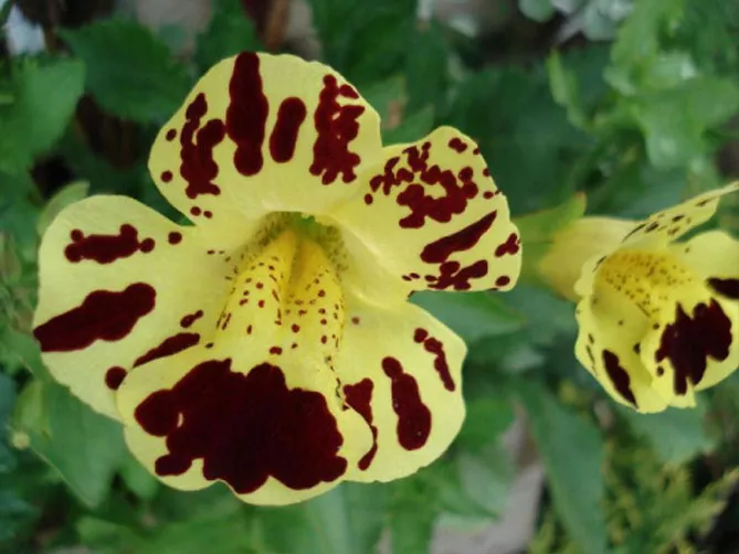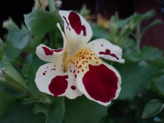 Двоколірні великі квітки мімулюса з'являються на верхівках пагонів на початку літа (червень-липень), вражаючи інтенсивністю забарвлення. Крім цікавої форми, їхня відмінна риса – рисунок у вигляді крихітних численних цяток, видимих на нижній пелюстці квітки у більшості сортів. Квітки залежно від сорту бувають різних кольорів – білі, жовті, оранжеві, рожеві, червоні, бордові, різнокольорові, вкриті контрастними, нерегулярними плямами та цятками.