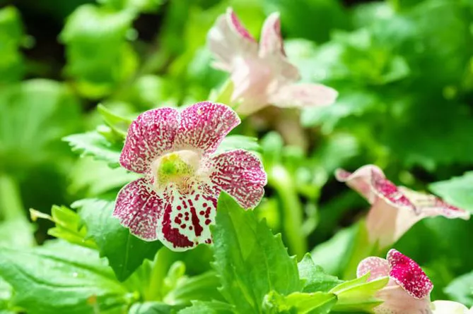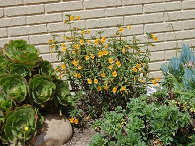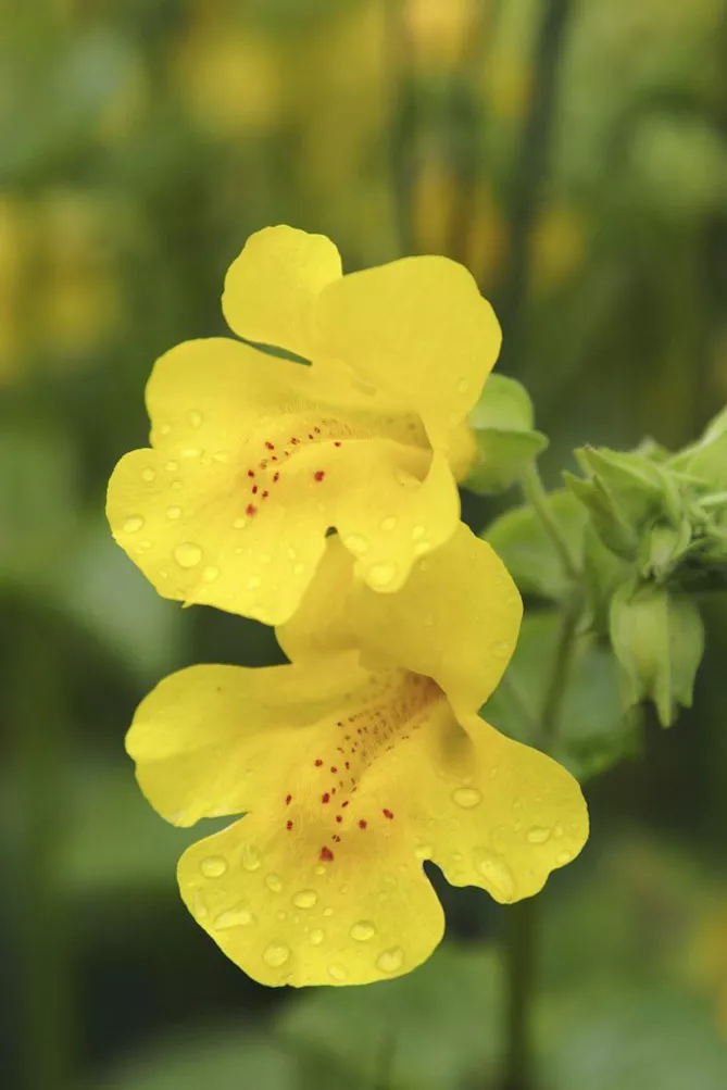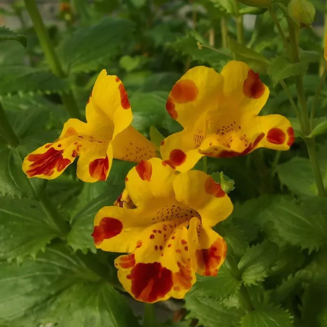 Витривалий багаторічний вид мімулюс крапчастий (Mimulus guttatus) цвіте у травні-червні маленькими яскраво-жовтими воронкоподібними квітками з червоними або коричневими цятками на задній стінці. Квітки поєднуються в грона. Висота рослини: 30 см, ширина: 60-100 см. Це ґрунтопокривна рослина, що вкорінюється на рівні вузлів. Листя овальне, зубчасте, зелене. Морозостійкість: -15-20 °С. Це хороший ґрунтопокривник.