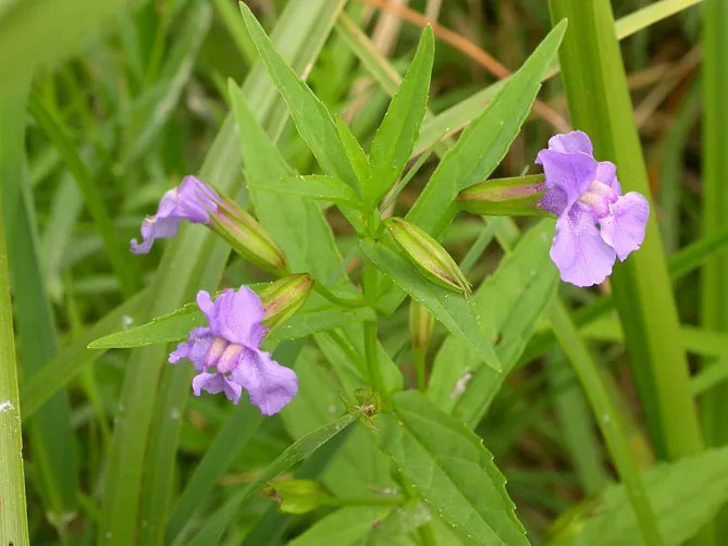 Витривалий багаторічний вид губастик розхилений (Mimulus ringens) цвіте з червня по серпень світло-фіолетовими квітками з виступаючими тичинками та вузьким горлечком. Висота: 60-100 см, ширина: 30 см. Рослина має кущисту форму, прямостоячі, гіллясті стебла. Листя ланцетне, вузьке, бронзове, потім зелене. Морозостійкість: до -30 °С.