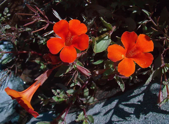 Однорічна рослина мімулюс мідно-червоний (Mimulus cupreus) цвіте з червня по вересень великими трубчастими квітками, пелюстки мідно-оранжеві з жовтим зівом. Висота: 10-20 см. Стелячі стебла вкриті дрібними зубчастими листочками з помітними жилками. Морозостійкий багаторічник, культивується як однорічник.