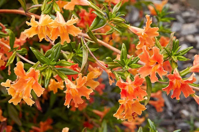 Губастик або мімулюс помаранчевий (Mimulus aurantiacus) родом з Північної Америки. Цвітіння: з червня по жовтень. Квіти великі, ніжно-помаранчеві, у формі довгої труби з зубчастими пелюстками, хвилястими по краях. Висота кущика: 60- 120 см, ширина 100 см. Кущ мало розгалужений, рихлий. Листя вузьке, вічнозелене, блискуче. Рослини морозостійкі до -10-12 °C у дуже добре дренованому ґрунті. Засухостійкий чагарник. Можна вирощувати у великому горщику.