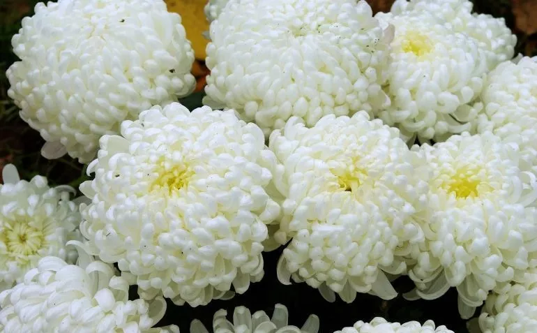 - Велика біла хризантема створює великі, білосніжні квіти діаметром до 12 см. Зовнішні пелюстки відхиляються, центральні пелюстки утворюють кулю. Цвіте з жовтня. У теплі зими може цвісти до грудня. Потрібен вологий ґрунт.