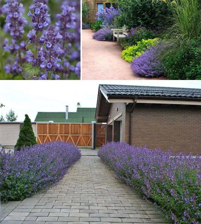 Nepeta faassenii – довгоцвітучий багаторічник, який цвіте все літо, з сильно розгалуженими пагонами висотою до 30 см. Листя сіро-зелене, квітки з'являються з травня по вересень. Особливих вимог немає, м'ята терпить помірну посуху. Росте добре у великих групах, висаджується в кількості 12 штук на 1 м².