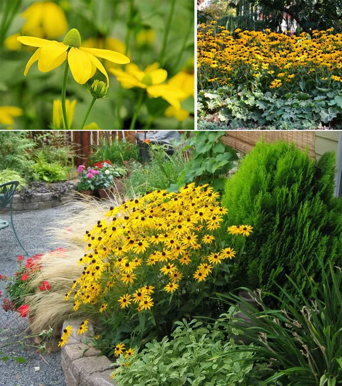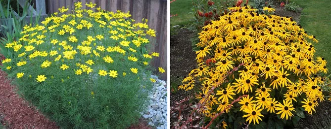 - На сонячних місцях веселі жовті плями утворюють, наприклад, невибагливі багаторічники: Рудбекія блискуча і Кореопсис мутовчатий.