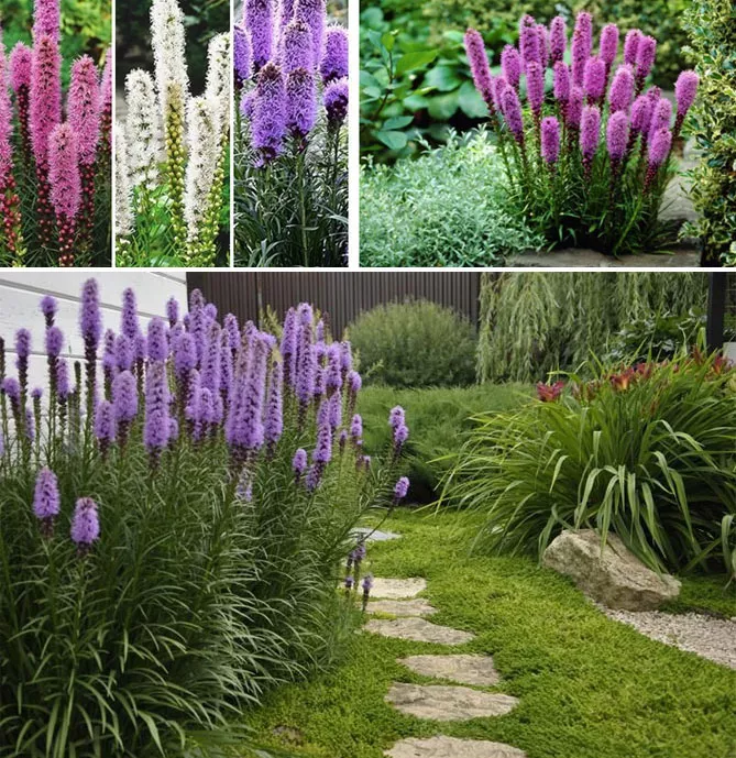 Квіти Liatris spicata має вузьке, майже трав'янисте листя, виростає до 70 см. Цвіте фіолетовими квітками з липня по вересень, квітки розвиваються з вершини пагона. Вимогливий до родючого, помірно вологого ґрунту. Разріджені суцвіття характеризуються високою міцністю. Висаджується по 12 штук на 1 м².