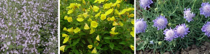 - Гідно виглядають рослини з фіолетовими квітами, такі як безцінна для сухих ґрунтів, особливо кам'янистих садів – котяча м'ята або шавлія пухнаста з численними інтенсивно забарвленими сортами, наприклад, «Ostfriesland» або «Mainacht». Варто врахувати, що з цими багаторічниками красиво компонують кущики з рожевими або білими квітками, що квітнуть протягом усього літа.