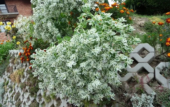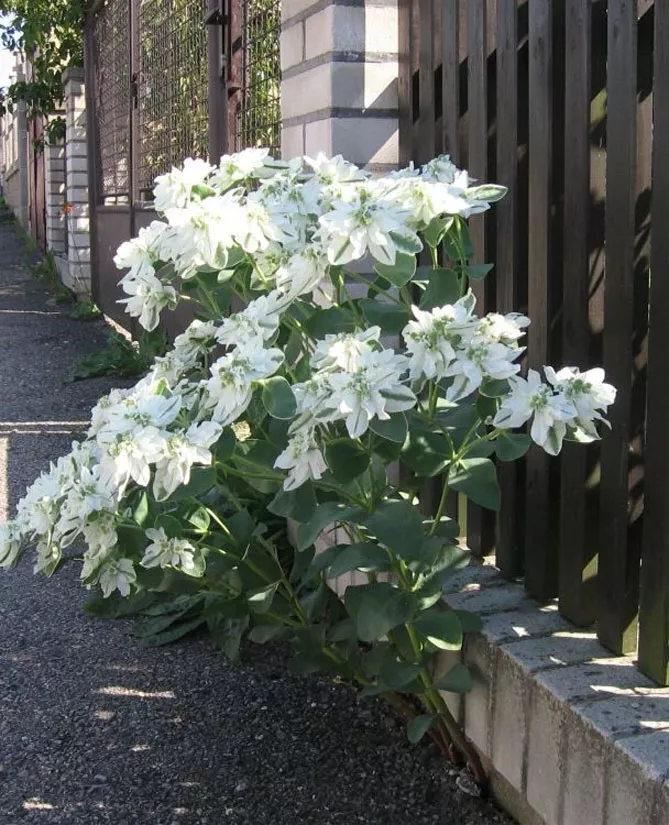 Один из наиболее любимых садовых видов – окаймленный молочай (E. marginata) высотой 60 см. Может достигать 100 см в высоту, но обычно достигает меньших размеров. Растение имеет густую окраску, приподнятые, жесткие, ветвистые побеги. Цветет летом (июль-август), развивая на верхушках побегов мелкие цветки, собранные в небольшие плотные соцветия. Украшение растения – крупные, яйцевидные, зеленые листья с широкой белой каймой, которая почти полностью покрывает пластинку молодых листьев.