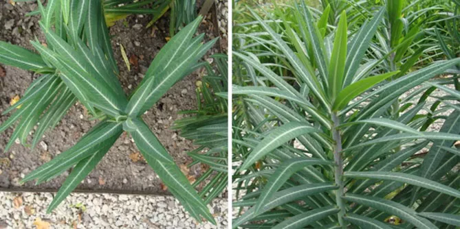 Фото. Стебель молочая Чины выглядит совсем иначе, чем часть с цветами и плодами. Стоит обратить внимание на характерно расположенные листья.