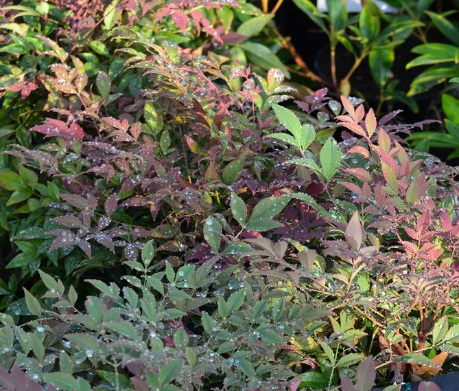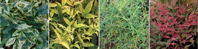 Фото. Різне листя: нандина ‘Twilight’, ‘Lemon Lime’, ‘Filamentosa’, ‘Obsessed Seika’