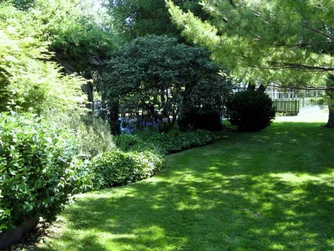 - з листяних чагарників мають чудовий вигляд азалії з кремовими або рожевими квітами, гортензії з красивими, білими квітами, самшит, кизильник, кизил, лігустри, барвінки;