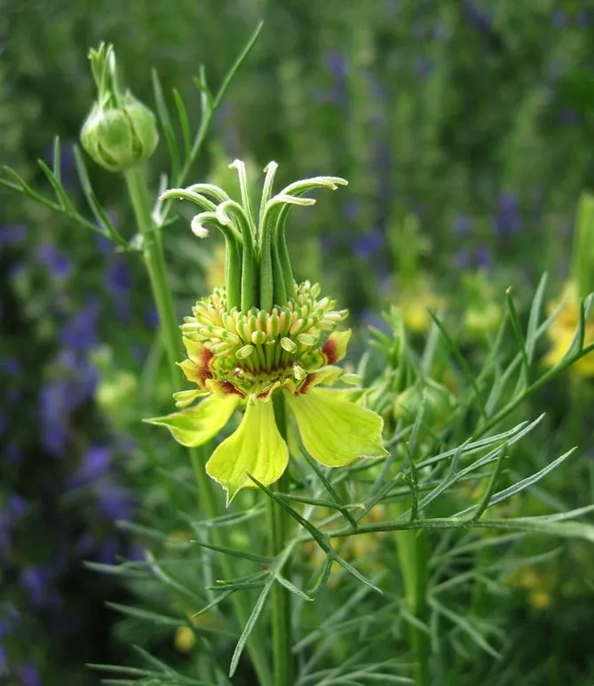 Ще один вид, який можна зустріти в саду – східна нігелла (Nigella oreintalis). Вона має не такі оригінальні квіти, як дамаська, але якщо подобаються клумби в натуралістичному стилі, варто придивитися до неї уважніше. Її вимоги та вирощування аналогічні нігеллі дамаській.