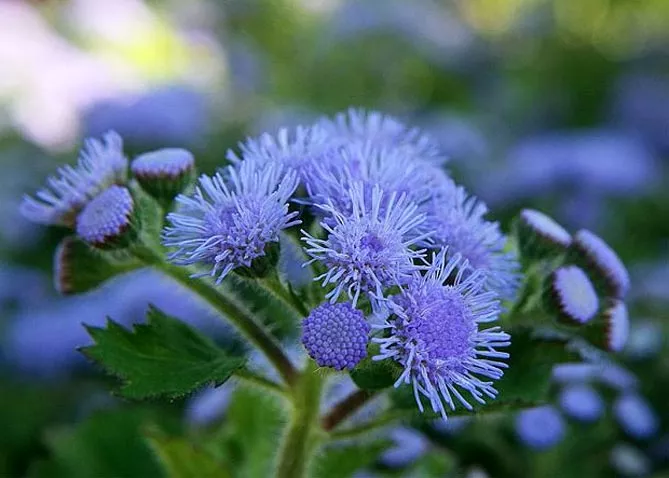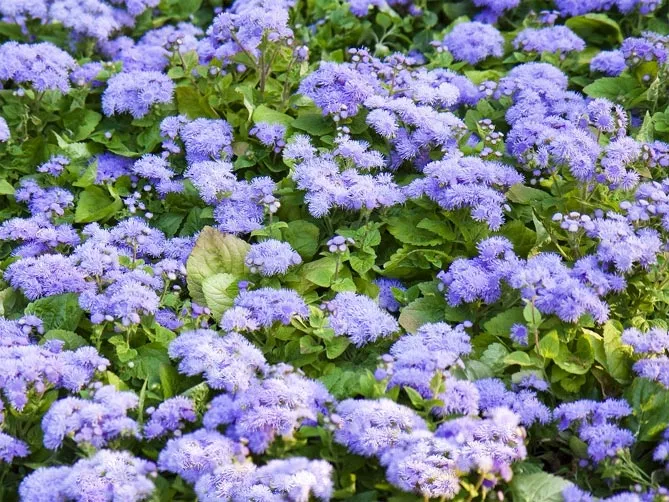 Аґератум Гаустона або довгоцвітка (Ageratum houstanianum) – однорічник виростає до 20-30 см у висоту. Цвіте в пурпурному або білому кольорі з червня по жовтень. Довгоцвітка добре ущільнюється, тому охоче садиться як бордюрна рослина.