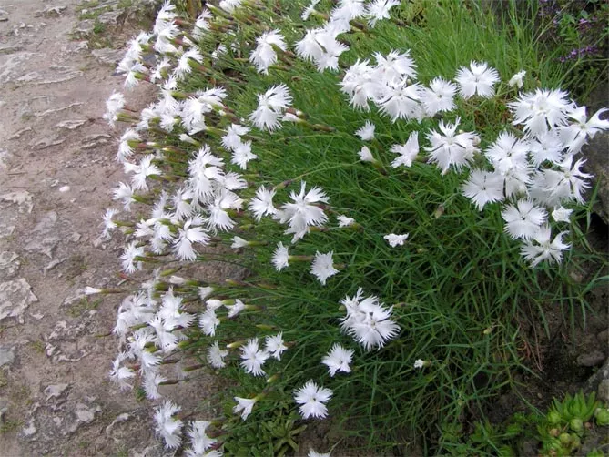 Це трав'яниста рослина невисокого зросту, висота досягає 30 см. Гвоздика продукує пучок привабливих, синьо-зелених, вузьких листків. Цвіте з травня по червень маленькими, перистими квітками білого або рожевого кольору. Добре росте на сухих ґрунтах.
