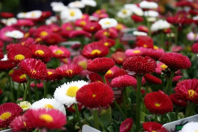 Декорativні квіти маргаритки (Bellis perennis) – дворічні рослини досягають висоти 4-20 см. Створюють розетки з лопатчастих листків. Кошики суцвіття мають біло-жовтий або рожевуватий відтінок. Маргаритка цвіте з березня по липень. Ці квіти часто вирощують в садах.