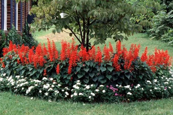 Декорativна шавлія блискуча або сальвія блискуча (Salvia splendens) росте до висоти 20-40 см, любить сонячні місця. Найпопулярніша червона шавлія, але можна вирощувати сорти з білими, лососевими або фіолетовими квітами. Цвіте з червня по вересень. Шавлія незамінна на великих квітниках і як бордюрна рослина.