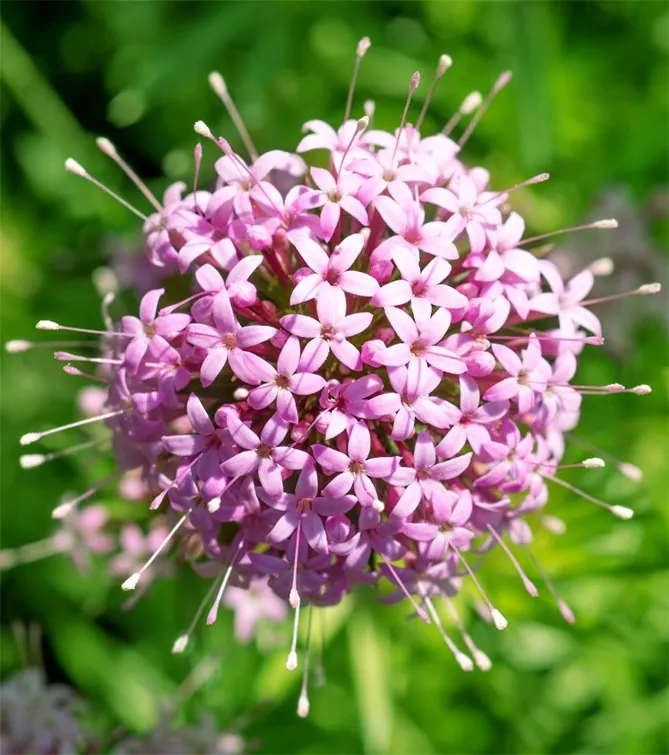 Маленькі, солодко-пряні квітки мають форму трубчастих воронок рожевого відтінку. Цвітіння триває з червня по серпень, на верхівках пагонів з'являються сферичні суцвіття. Характерна особливість – довгі, опуклі шийки маточки.