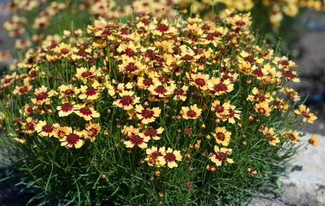Кореопсис (Coreopsis lanceolata) – створює рихлі пагони, довжиною 40 см. Це багаторічна рослина з великими жовтими квітами з коричневим акцентом біля основи пелюсток. Цвітіння відбувається багаторазово з травня по жовтень. Це рослина з дуже маленькими вимогами.