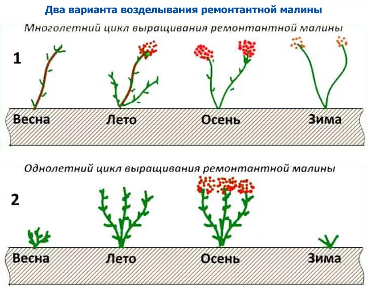 Вибір пагонів, що підлягають видаленню, залежить від сорту. Традиційна дворічна малина плодоносить на минулорічних пагонах, плоди дозрівають на межі червня-липня. Ремонтантні сорти також дають урожай на пагонах цього року, які виникають з бруньок, сформованих на молодих пагонах. Цей урожай формується пізніше – з серпня по жовтень.