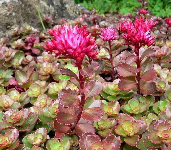 - «Fuldaglut» – сорт відрізняється коричнево-червоним кольором листя. Якщо рослині забезпечити сонячне положення, простір саду прикрасять яскраво забарвлені листки. У затінених місцях рослини стають зеленими. Багаторічник лежить на землі, суцвіття виростають до 15 см. В літні місяці (липень-серпень) з'являються зірчасті темно-рожеві квіти. Сорт «Fuldaglut» чудово виглядає в альпінаріях, для озеленіння стін, покриття великих площ саду. В період цвітіння прикрашений рожевим квітковим килимом.