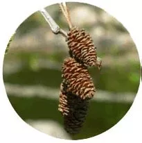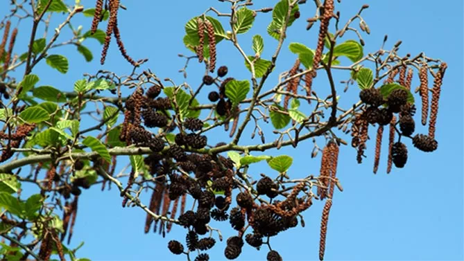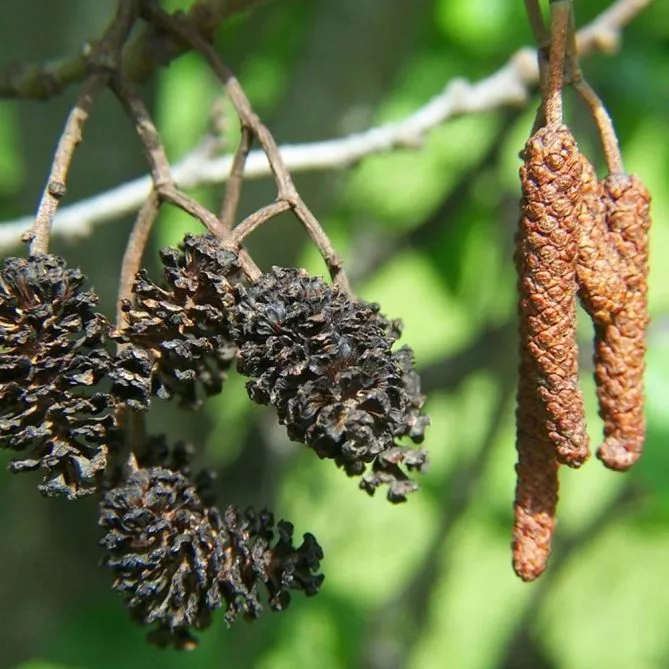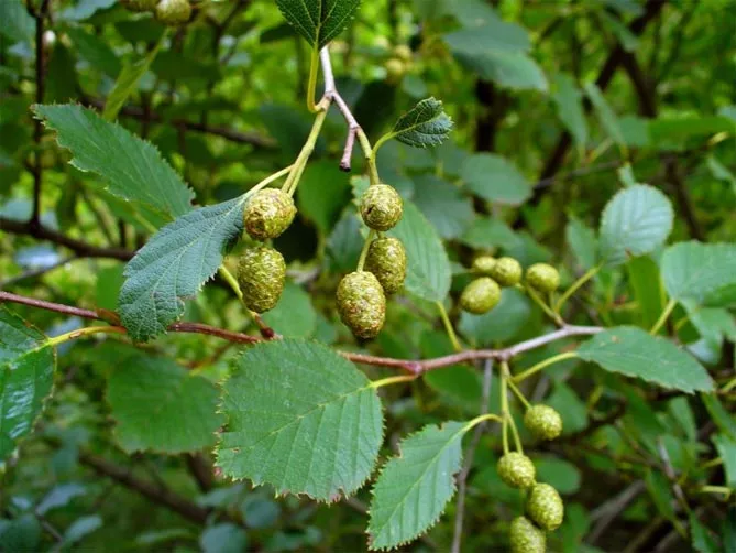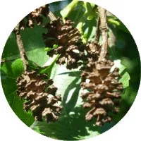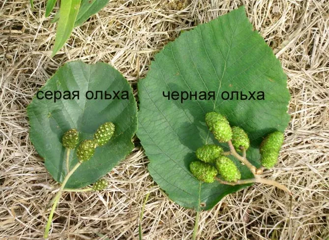 | Сережки – чоловічі суцвіття. | Листки – яйцеподібні або еліптичні, завдовжки до 6 см, загострені, з подвійними різаними краями. Жилки виразно видно, у кількості 5-10 пар, у кутах злегка опушені. | Стиглий плід – шишка. Плід кулястий або яйцеподібний, сильно здерев'янілий, нагадує виглядом крихітні соснові шишки. Містять горішки. Вони залишаються на рослині надовго. |