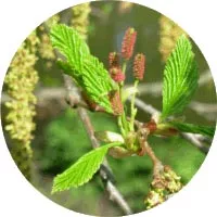 | Сережки. Цвіте задовго до розвитку листя. Чоловічі квіти зосереджені у жовтих сережках. | Листки складено складчасто, мають вигляд звивистих, яйцеподібних або круглих, одиночних, довгочерешкових. Край листової пластинки зубчастий. Лист має 5-7 пар жилок, темно-зелений. |