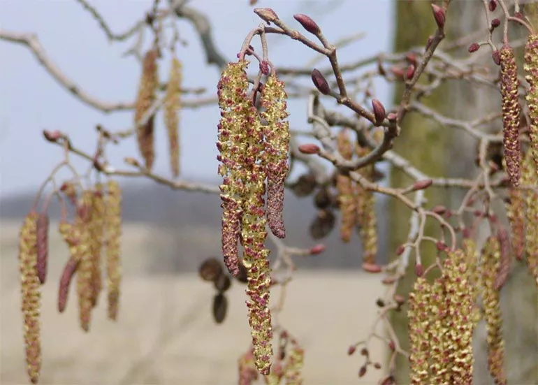 Бруньки опуклі, конічні, вкриті 4-6 пурпурно-коричневими або зеленуватим рісничками лусочками, іноді злегка липкими. Рослина однодомна (на одній рослині з'являються окремі чоловічі та жіночі суцвіття). Перед зимою на гілках з'являються зачатки чоловічих і жіночих суцвіть, які цвітуть лише навесні. Вони цвітуть одночасно з розвитком листя (квітень-травень) і є вітрозапильними.