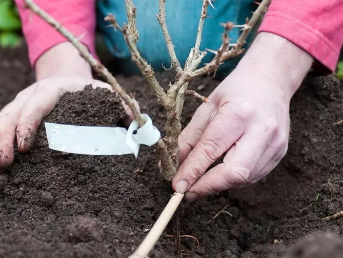 Кореневу шийку заглиблюють на 5-8 см. Якщо пагін один, його розташовують під кутом 30-45°. Кущ старший заглиблюють більше, а бічні гілочки розводять у сторони і присипають землею.