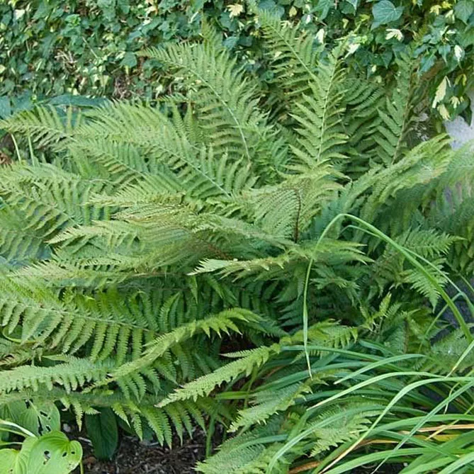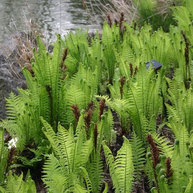 Садовый вид папоротника Страусник обыкновенный (лат. Matteuccia struthiopteris) достигает 80 см. Достаточно распространен в России, растет в Средней Полосе, Забайкалье, Приморье, Тюменской, Иркутской областях и других регионах. Вид особенно элегантен, с крупными прямостоячими листьями красивого нежно-зеленого цвета. Его также называют черный папоротник или разнолистник, он обладает большим очарованием и создает величественный эффект. Произрастая естественным образом на берегу ручьев, вид идеально подходит для оживления берегов водоема! Его лучше сажать в группе по 5-10 штук.
