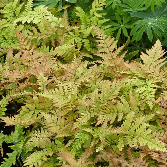 Азиатские папоротники предлагают самые разнообразные оттенки так называемых листьев. Например, у Кочедыжника ниппонского «Пиктум» (‘Pictum’) эффектная серебристая листва с пурпурным оттенком. У Щитовника красносорусового (Dryopteris erythrosora) великолепные листья, со временем меняющие цвет: сначала оранжево-розовые, когда развернутся становятся бронзовыми, затем темно-зелеными.