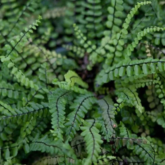 Адиантум стоповидный (лат. Adiantum pedatum) – папоротник отличается чрезвычайно легкой, тонкой, хрупкой листвой. Черные черешки резко контрастируют с нежным зеленым цветом листьев. Ценит слабокислые почвы, но терпит известняк. Высота растения – 60 см.