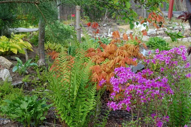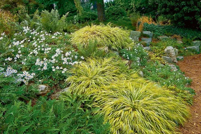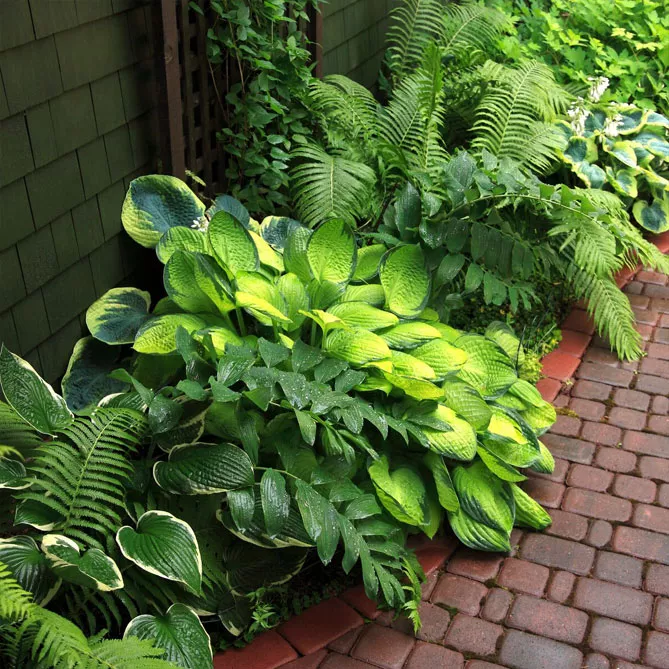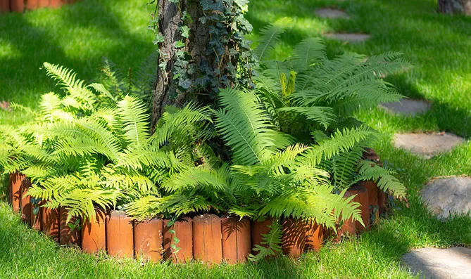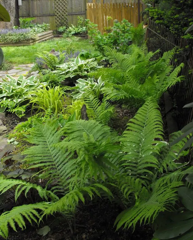 Таким образом, вы получите сад в современном стиле с четкими линиями и спокойными цветами. Самые большие папоротники обеспечивают структурированный фон, их можно посадить на заднем плане клумбы. Они создают довольно сдержанный декор в прекрасном зеленом оттенке, который будет оттенять более яркие цветы, которые можно посадить перед ними.