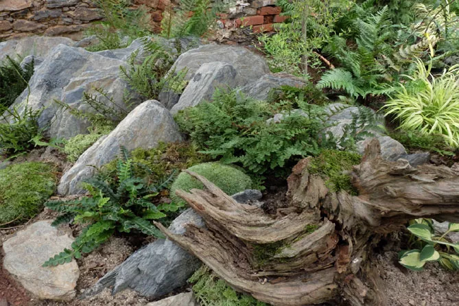 Некоторые папоротники (костенец, многоножка), хорошо смотрятся в альпинариях. Можно высадить их на старых пнях. Костенец сколопендровый Asplenium scolopendrium и Кочедыжник ниппонский «Пиктум», хорошо адаптируются к зеленым стенкам растений. Костенец волосовидный может расти на каменной стене, стволе дерева.