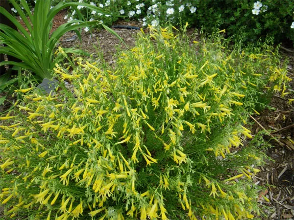 - Пенстемон сосноволистный (Penstemon pinifolius) – высотой 15-20 см, с игольчатыми вечнозелеными листьями и мелкими темно-оранжевыми цветами, цветущими все лето. У сорта «Мерси еллоу» Mersea Yellow – желтые цветки появляются в мае – августе. Требуется кислый субстрат.