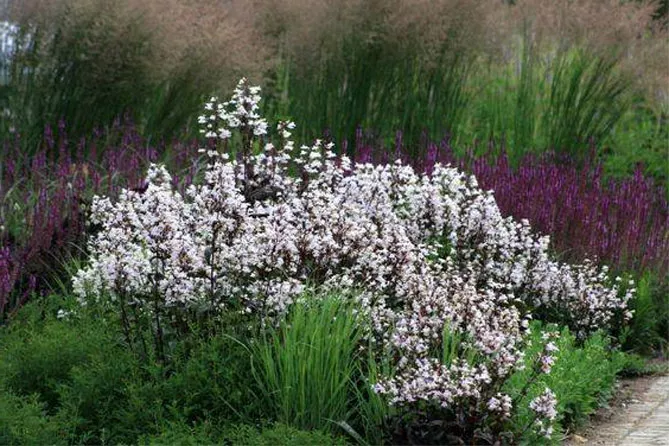 Среди новинок заслуживает внимания высокий сорт «Дак тоуверс» Dark Towers (70-80 см). Образует плотные кустики глянцевых листьев шоколадного цвета, а в августе и сентябре появляются бледно-розовые цветки. Ему нравится солнце, но он переносит частичное затенение.