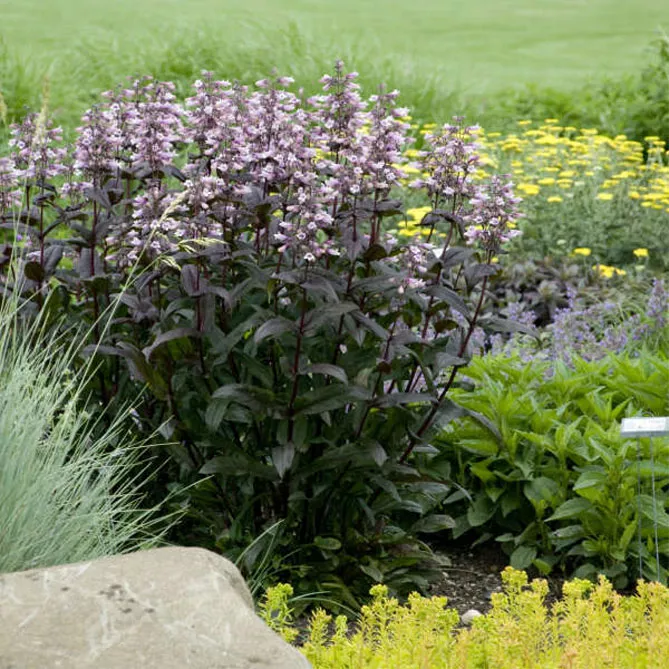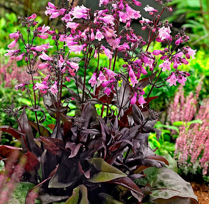 Такую же высоту имеет мексиканский пенстемон (Penstemon × mexicale) «Санберст руби» Sunburst Ruby с более тонким силуэтом и узкими блестящими листьями. С июня по сентябрь он выпускает крошечные амарантовые цветы.