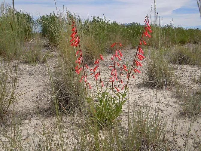- Пенстемон бородатый (Penstemon barbatus) – самый распространенный. Имеет длинные листья (до 20 см), цветет с начала лета до поздней осени, его красные цветки собраны в метельчатые соцветия. Обычно вырастает до 80 см, но доступны низкие сорта (достигающие 5 см – они отлично подходят для выращивания в контейнерах).
