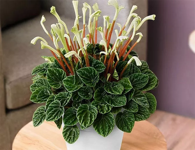 Пеперомия сморщенная (Peperomia caperata) – многолетнее растение, достигающее высоты 15 см. Главное его декоративное достоинство – темно-зеленые, мясистые, сильно сморщенные листья. Примечательны также белые цветы, растущие на толстых стеблях. Цветки напоминают усы, их иногда называют мышиными хвостами.