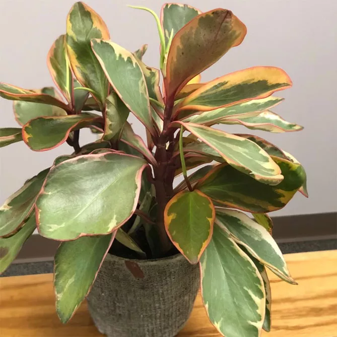 Пеперомия клузиелистная (Peperomia clusiifolia) – вечнозеленое растение с мясистыми короткими ветвистыми, иногда ползучими стеблями. Часто побеги имеют красноватый цвет. В высоту достигает 20-30 см. Листья мясистые, овальные, тупоконечные, длиной 15 см с пурпурной каймой.