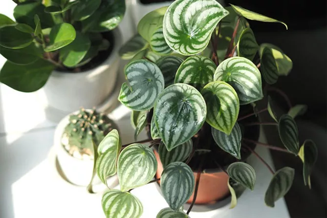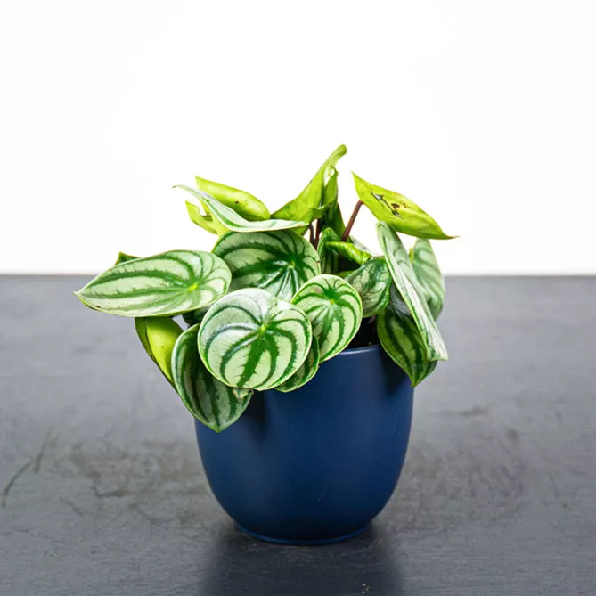 Пеперомия арбузная (Peperomia watermelon) – вид с декоративными листовыми пластинами, напоминающими корку арбуза и пурпурными стеблями. Высота растения – 30 см.