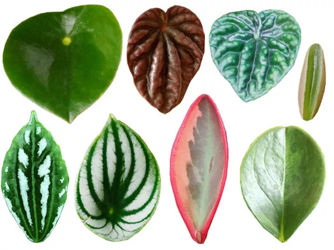Листья могут иметь различный цвет и фактуру листовой пластинки. Бывают морщинистыми (П. Клузиелистная) или гладкими, как у ампельной пеперомии головатой (Peperomia glabella).