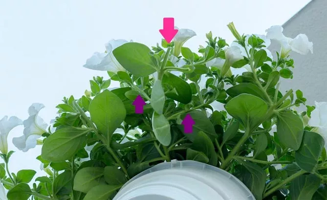 Фото. На примере белой сурфинии видно, как выглядит цветок без обрезки. Вырастает один длинный побег без отростков по бокам. Только после обрезки он начнет разрастаться.