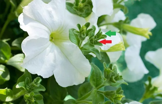 Фото. Красной стрелкой отмечена часть, которую необходимо удалить. Молодой бутон отмечен зеленым. Улавливая пучок пальцами, можно почувствовать маленький шарик внутри.