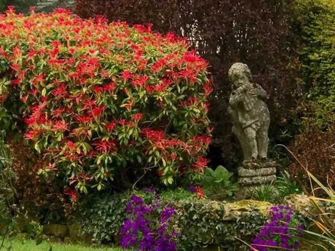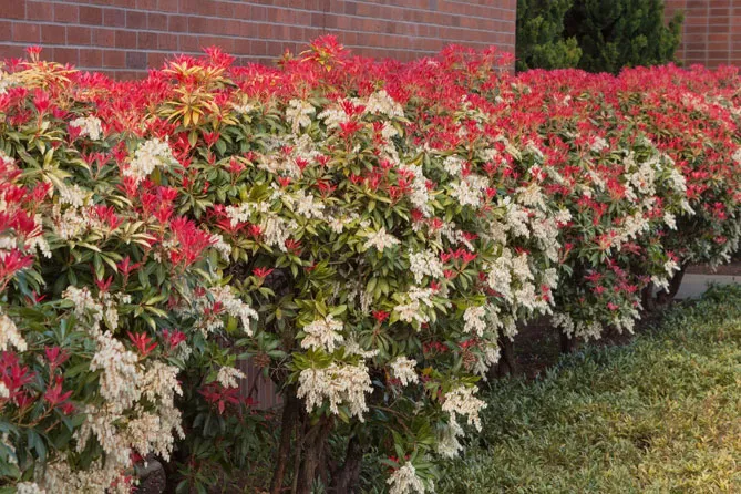 Пиерис с его вечнозеленой и густой листвой идеален в качестве живой изгороди: он сразу создает эффектную ширму, очень декоративную весной.