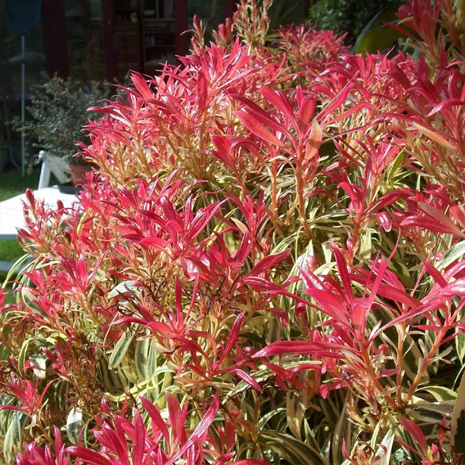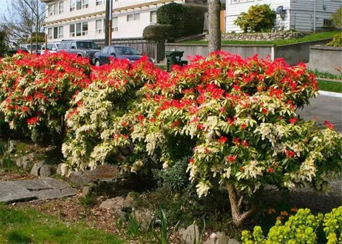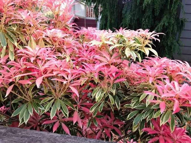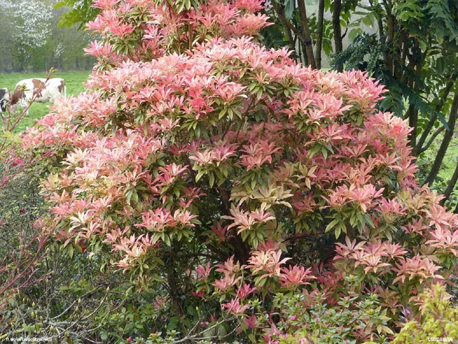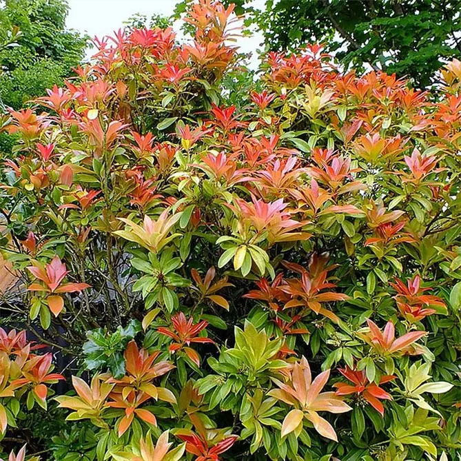 Сорт пиериса «Форест Флэйм» (P. japonica Forest Flame) цветет с апреля по май. Высота в зрелом возрасте – 1,5 м. Молодые листья ярко-красные, затем становятся розовыми, кремовыми, зелеными. Весной куст расцветает белыми цветами. Это сорт с большим развитием, идеально вписывается в живую изгородь.