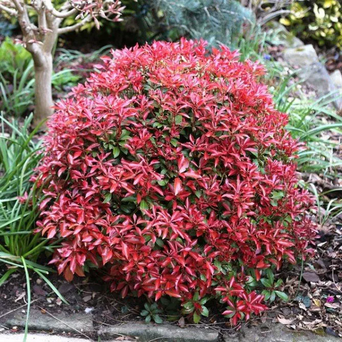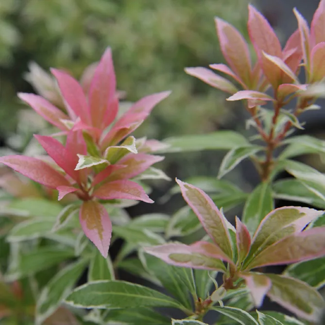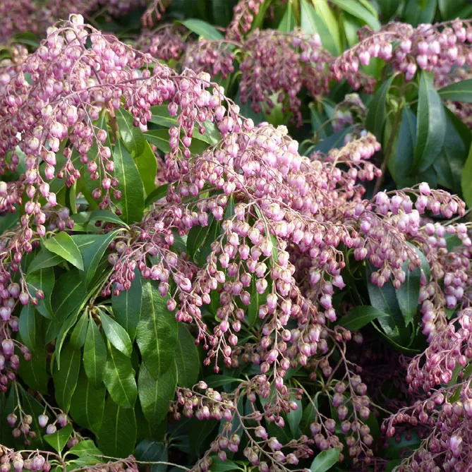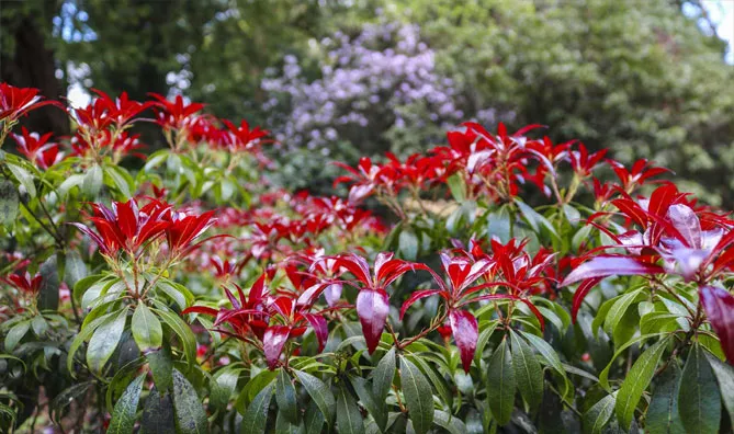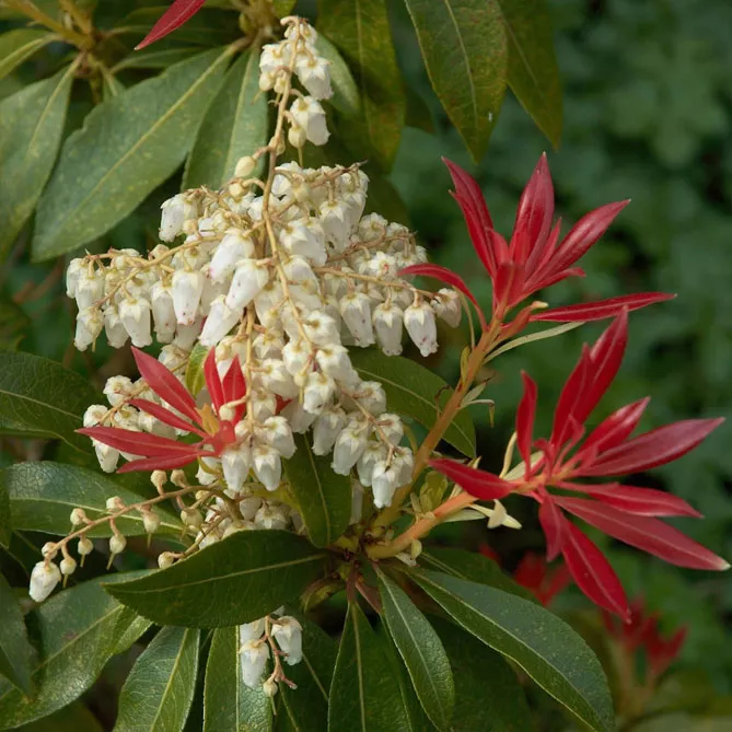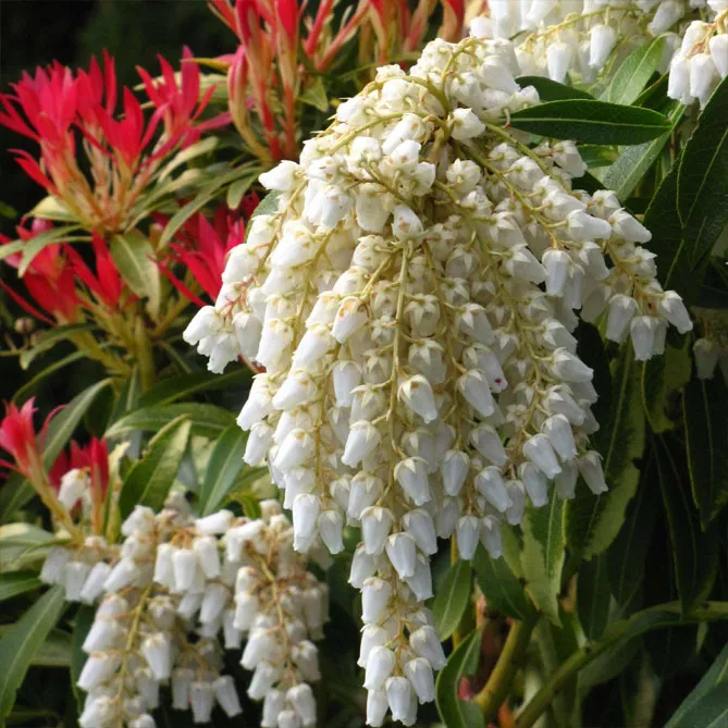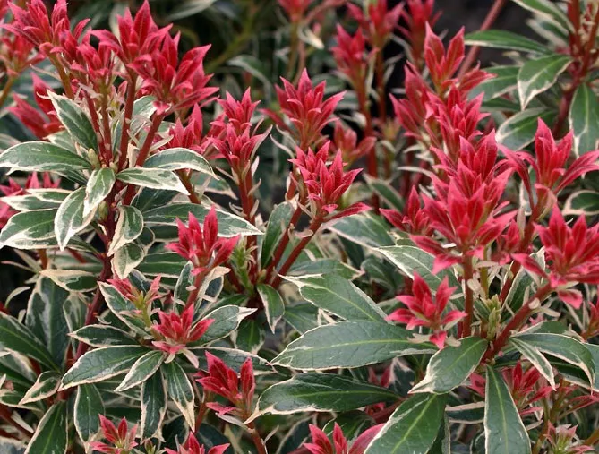Пиерис японский имеет молодые побеги багрово-красного оттенка. Он внесет много красок в живую изгородь или на задний план клумбы! Хотя его выращивают в основном из-за его оригинальной листвы, пиерис имеет красивое весеннее цветение, иногда очень впечатляющее. Цветки – мелкие белые или розоватые колокольчики, собранные в соцветия-метелки.