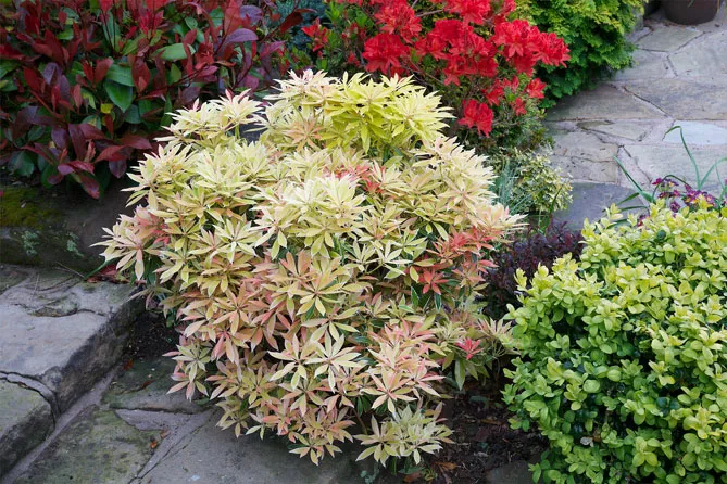 Сочетайте превосходные цвета пиериса с другой декоративной листвой, включая самую светлую, посадив рядом: