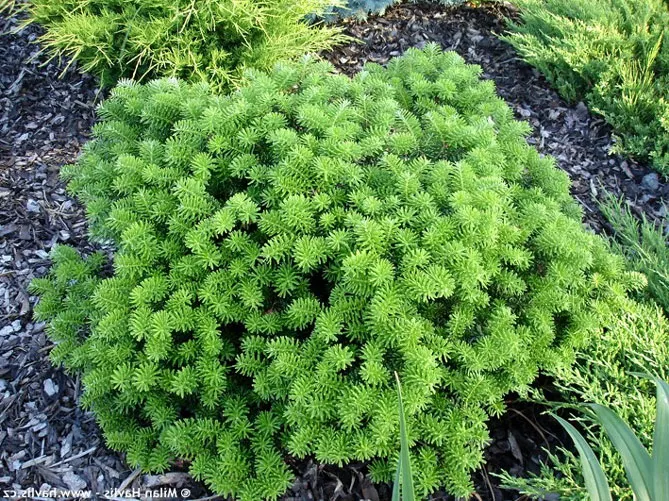 Интенсивно зеленый сорт «Грин Карпет» (Green Carpet) обязан своим названием, переводящимся, как «зеленый ковер», тому факту, что растет в стороны гораздо больше, чем вверх, не давая основного побега. Его ценят даже владельцы альпинариев. Однако растет он очень медленно.