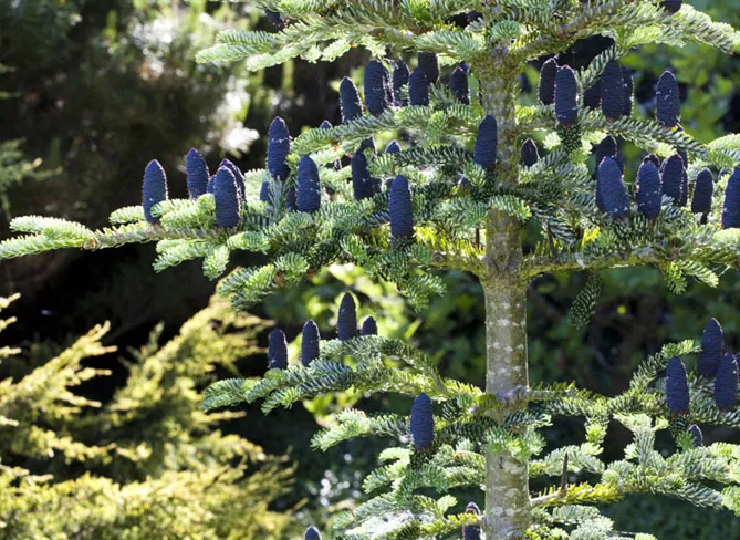 - Шишки. Уже на молодых растениях (даже высотой 1 м) можно увидеть характерные сине-фиолетовые, узкие, цилиндрические, прямостоячие, длинные (7 см) шишки. Они появляются после нескольких лет выращивания. Шишки обычно растут группами по несколько штук рядом, со временем меняют цвет на коричнево-зеленый, при созревании не опадают с дерева, а рассыпаются.
