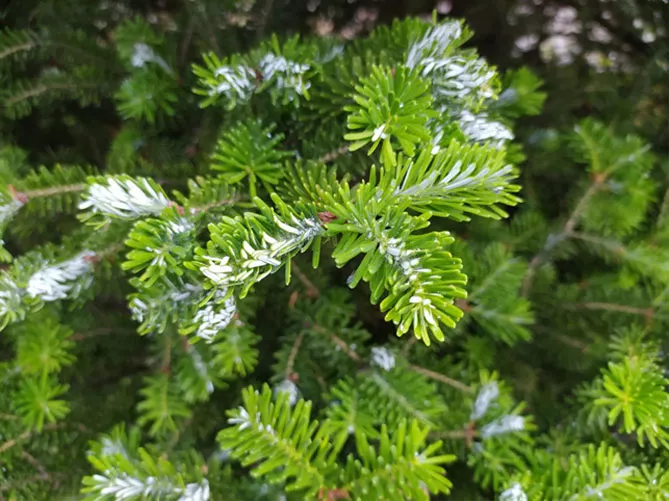 - Листья – плоские иглы длиной 1-2 см, шириной 2-2,5 мм и толщиной 0,5 мм. Радиально расположенные на побегах, окружают ветку, темно-зеленые сверху и беловатые (мелово-белые) снизу. Хвоя пихты на верхушке закругленная или тупо вдавленная и дугообразно торчит вверх.